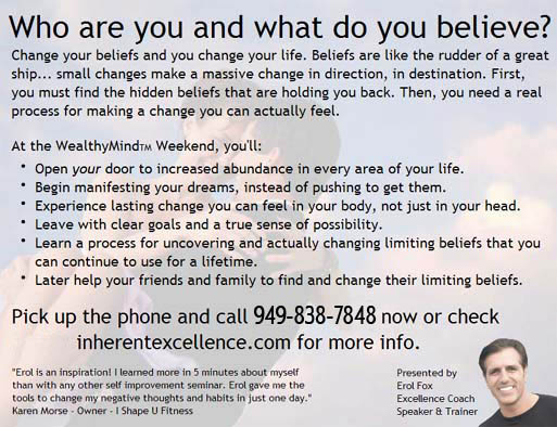 financial freedom! WEALTH STARTS IN THE MIND! Space is limited. Pick up the phone and call now to reserve your seat. Dates:Dates to be announced. Please contact us immediately for more details! Inherent Excellence 2-Day IntensiveWhat if, in 2 days, you learned how to use the tools you already have, make them work better, get new tools, and find out what's limiting you? How about leaving with deep clarity of your destiny? This intensive is about YOU! Your dreams and your change. This isn't one of those motivation seminars. This is a deep workshop for people that want real lasting change. You'll learn where limiting beliefs come from and we'll do exercises for real lasting change. We won't just talk about excellence, you'll "get it in the muscle" and walk, or fly, away with a different perspective on your dreams and what's holding you back. Learn how to tap into your Inherent Excellence and naturally create a new experience of life and goals. Day 1 - Know Thyself - What it's like to be Human